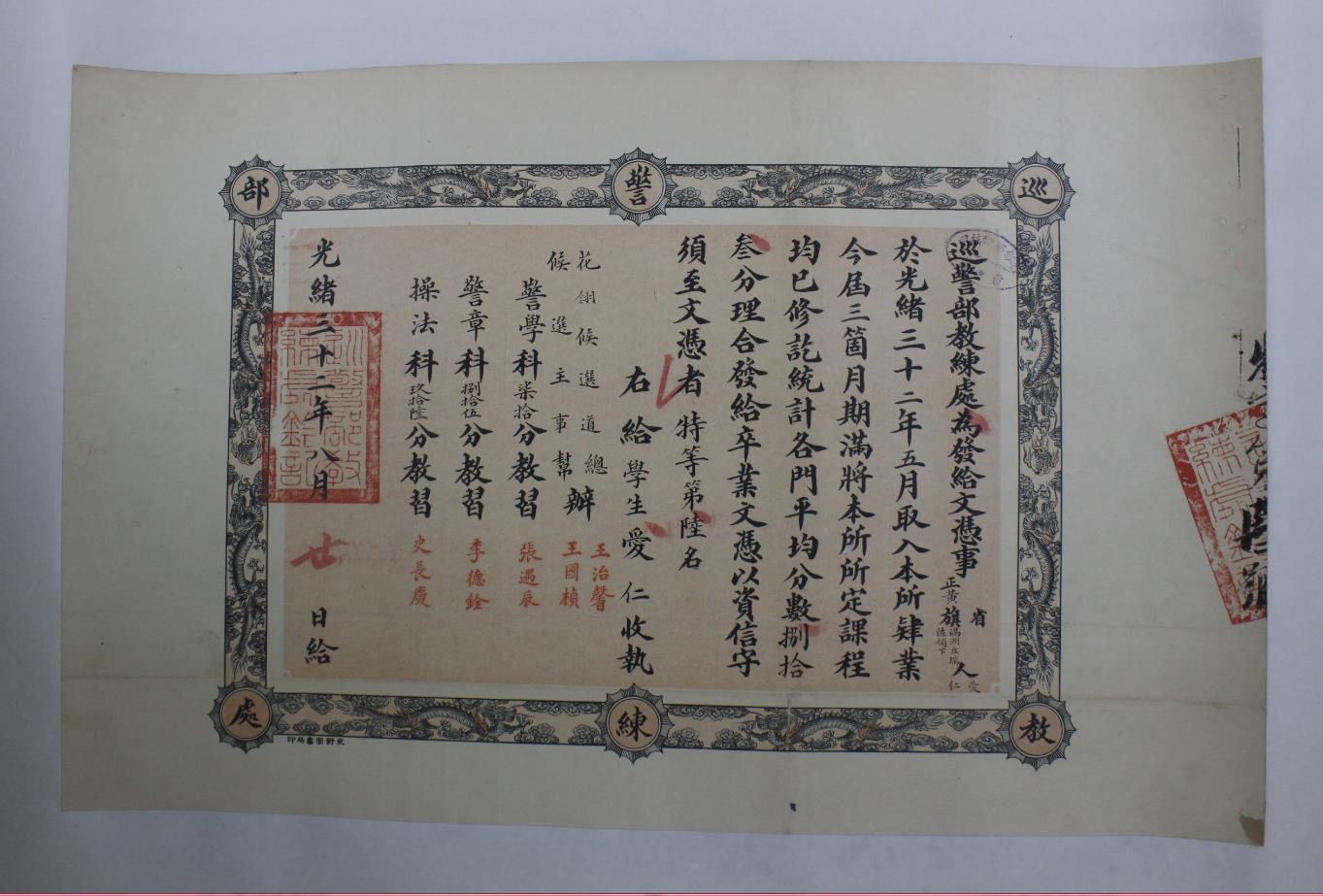 1906年清政府巡警部教练处颁发的卒业文凭证书(国家一级文物)