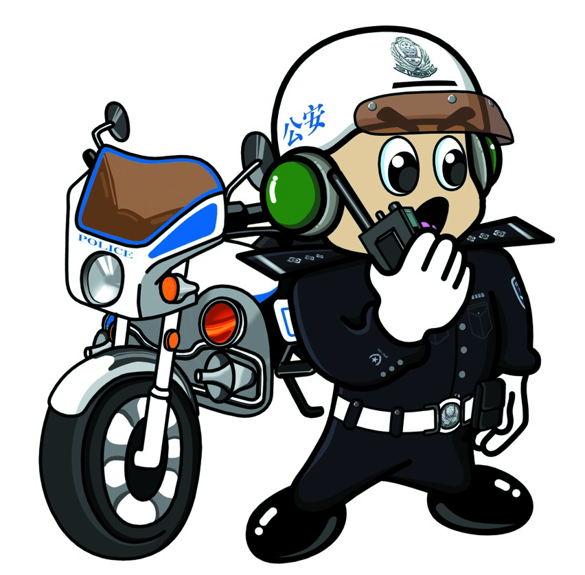 交警卡通形象设计以“骑警”为主体形象。中等身材,头戴白色钢盔,身着交警服装。双耳配以代表着最新科技的雷达系统装置,使他们可以在最短的时间内迅速收集到所辖区域的交通信息。而其正在指挥交通的动作和身后那部随时可以风驰电掣的专用摩托车,充分体现了当代交警快捷到达现场、及时解决问题,严格执法的良好形象。同时,卡通面部采用了柔中带刚、刚柔并济的风格,干练中透出友善,又突出了交警作为都市交通疏导者亲切、为民的形象。