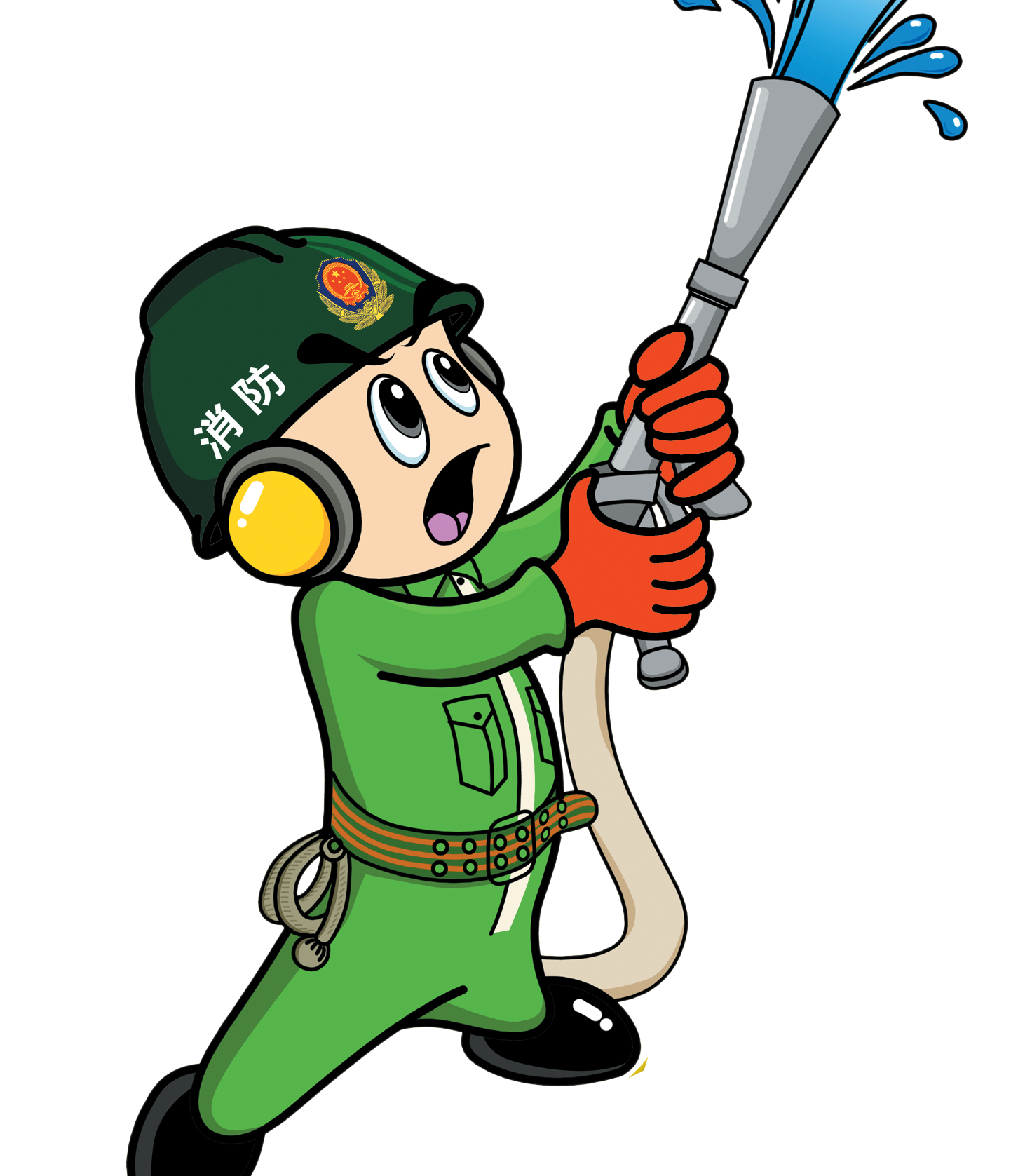 此款卡通形象强调智勇、灵活、亲和融为一体的概念。“眉形”设计成意化的水形眉,“脸型”也较为圆润,而身形的设计纤长灵巧,表现了消防警身手敏捷,不畏危险而又亲和百姓的形象。为了强化这一概念,此款卡通服装采用了消防警的标准服饰(深绿色钢盔 绿色战斗服);动作上采用了水枪救火的专业特点,以为公众识别。