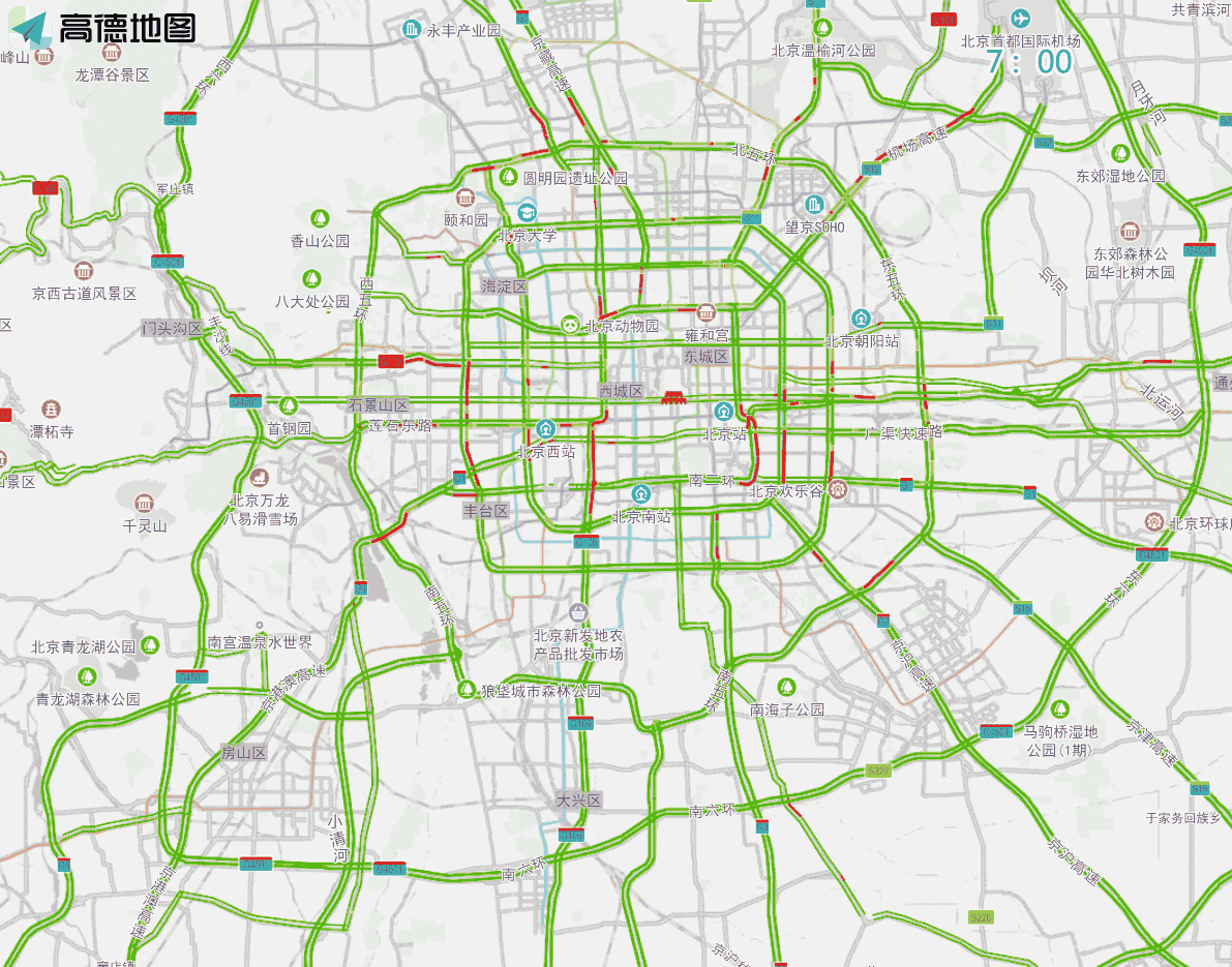 虽然高速公路不免费,预计今年部分高速仍将出现“前期出京、后期进京”的潮汐车流。假期三天的7时至13时,京藏、京承、京沪、京哈等高速和部分国道出京方向的交通压力将明显上升,其中京藏高速八达岭路段、京承高速望和桥至顺义段等通行压力大;望和桥、健翔桥、来广营桥等环路和高速公路相交的桥区节点也容易出现因车流量大引发的通行不畅情况。